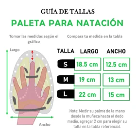 Las paletas de natación deben ser entre 1 y 2 cm más grandes que la mano para mejorar la técnica y aumentar la fuerza, generalmente clasificadas en tallas chica (técnica/iniciación), mediana (versátil) y grande (avanzados/fuerza). Se usan con ligas en el dedo medio y mano, siendo ideales para el entrenamiento superior.