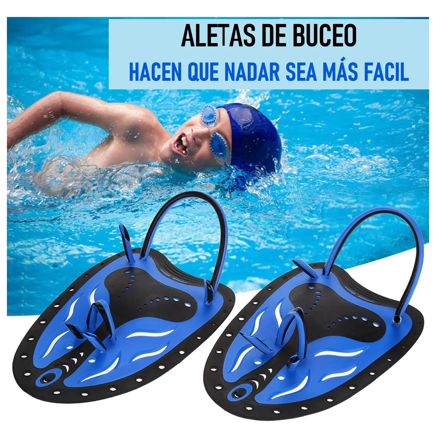 Las paletas de natación deben ser entre 1 y 2 cm más grandes que la mano para mejorar la técnica y aumentar la fuerza, generalmente clasificadas en tallas chica (técnica/iniciación), mediana (versátil) y grande (avanzados/fuerza). Se usan con ligas en el dedo medio y mano, siendo ideales para el entrenamiento superior.